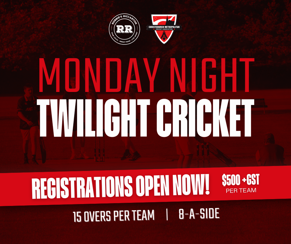 Christchurch Metro Cricket, run the popular Robbie's Riccarton Twilight Cricket during the warm summer months starting in November.